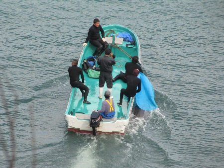 When the pods of dolphins are more sizable, an additional slaughter boat is being employed. Here the dolphins are being killed and gutted. The drive-hunt boats are also participating in this.