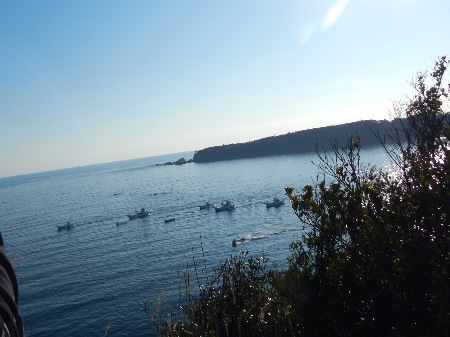 Die gesamte Treibjagdflotte befindet sich vor der Küste und ist auf der Suche nach einer Delfin-Gruppe.